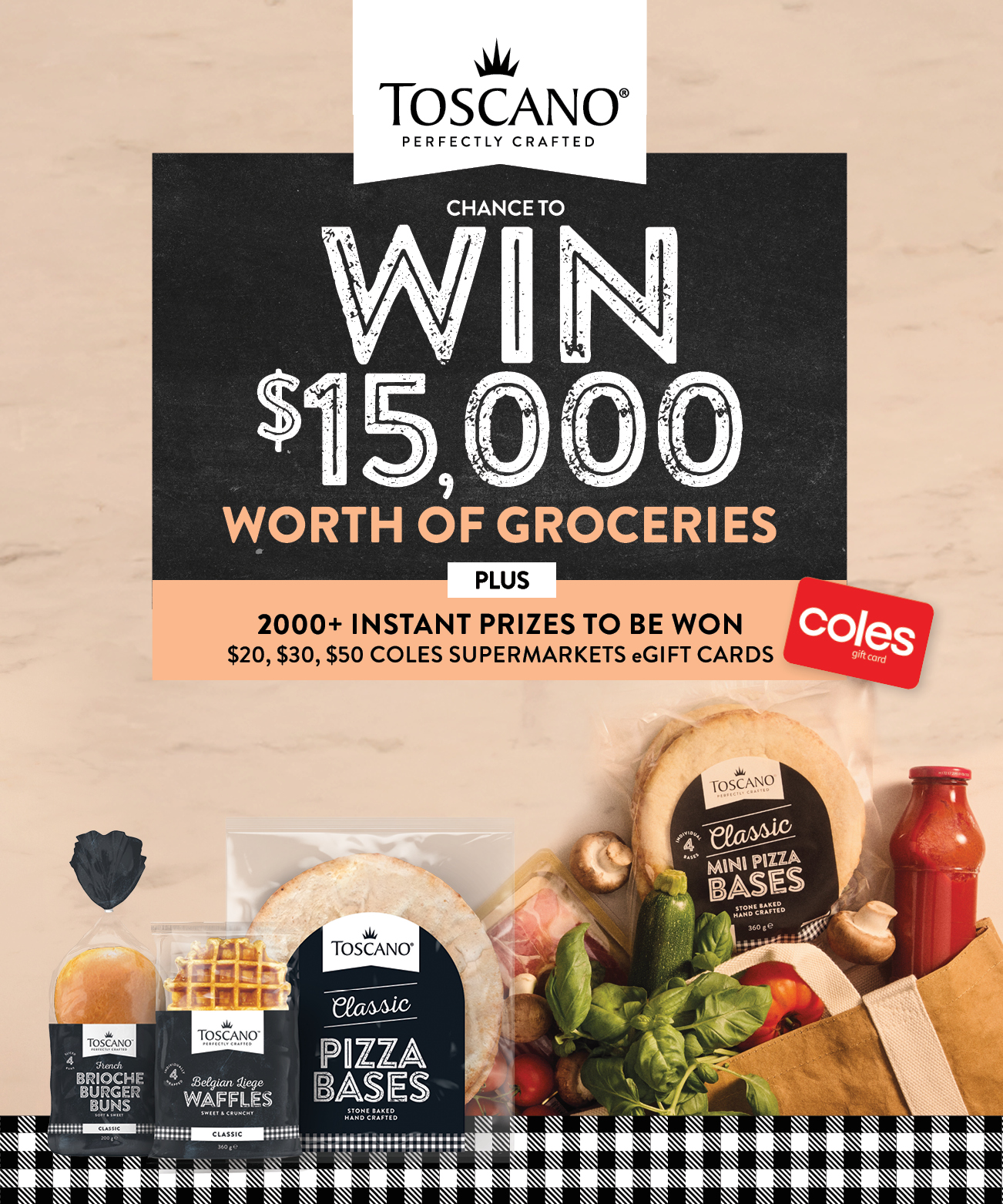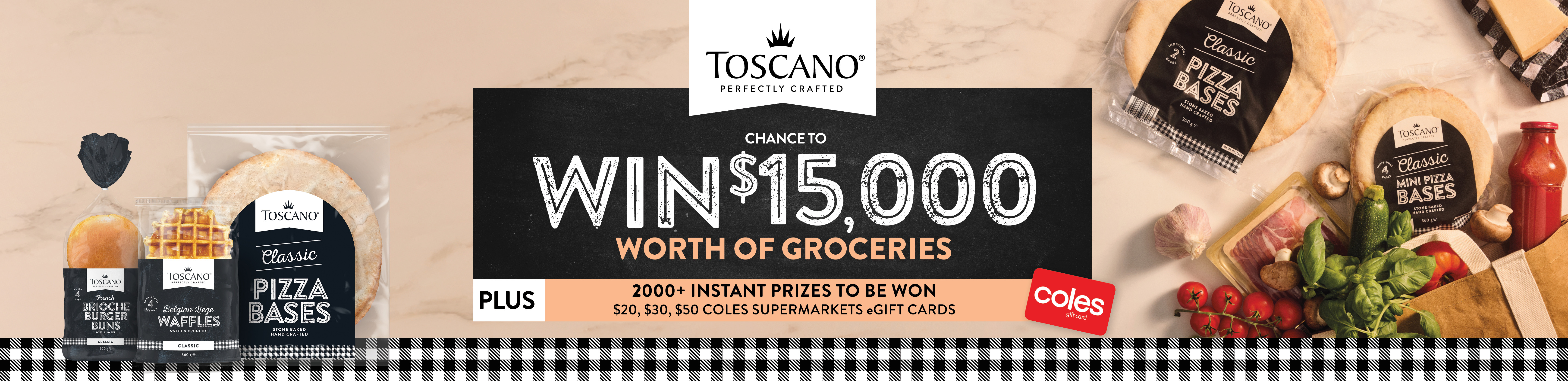 Entry is open to Australian residents aged over 18 years. To enter the Promotion, the entrant must purchase any Toscano product from a Coles Supermarket within Australia and provide Proof of Purchase.